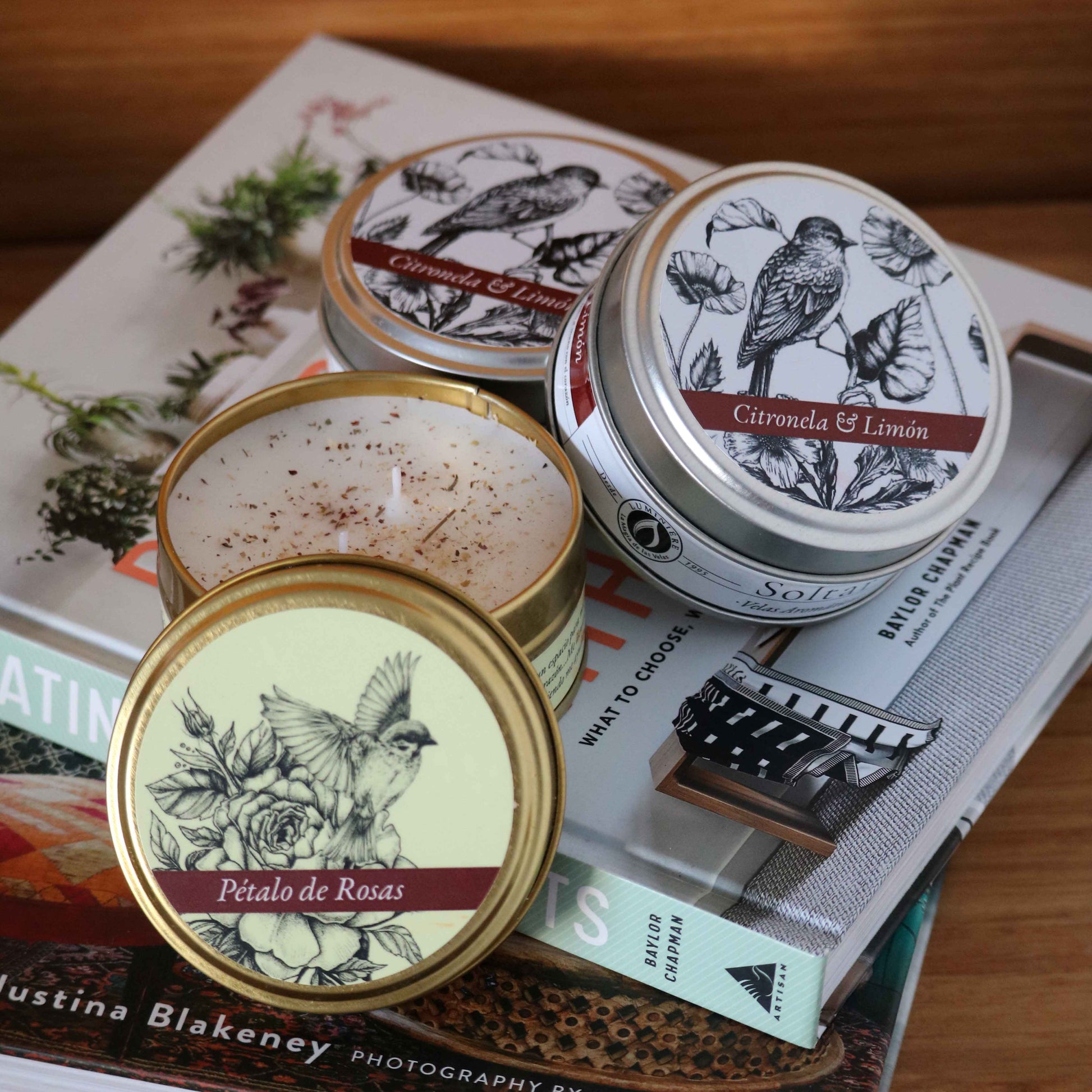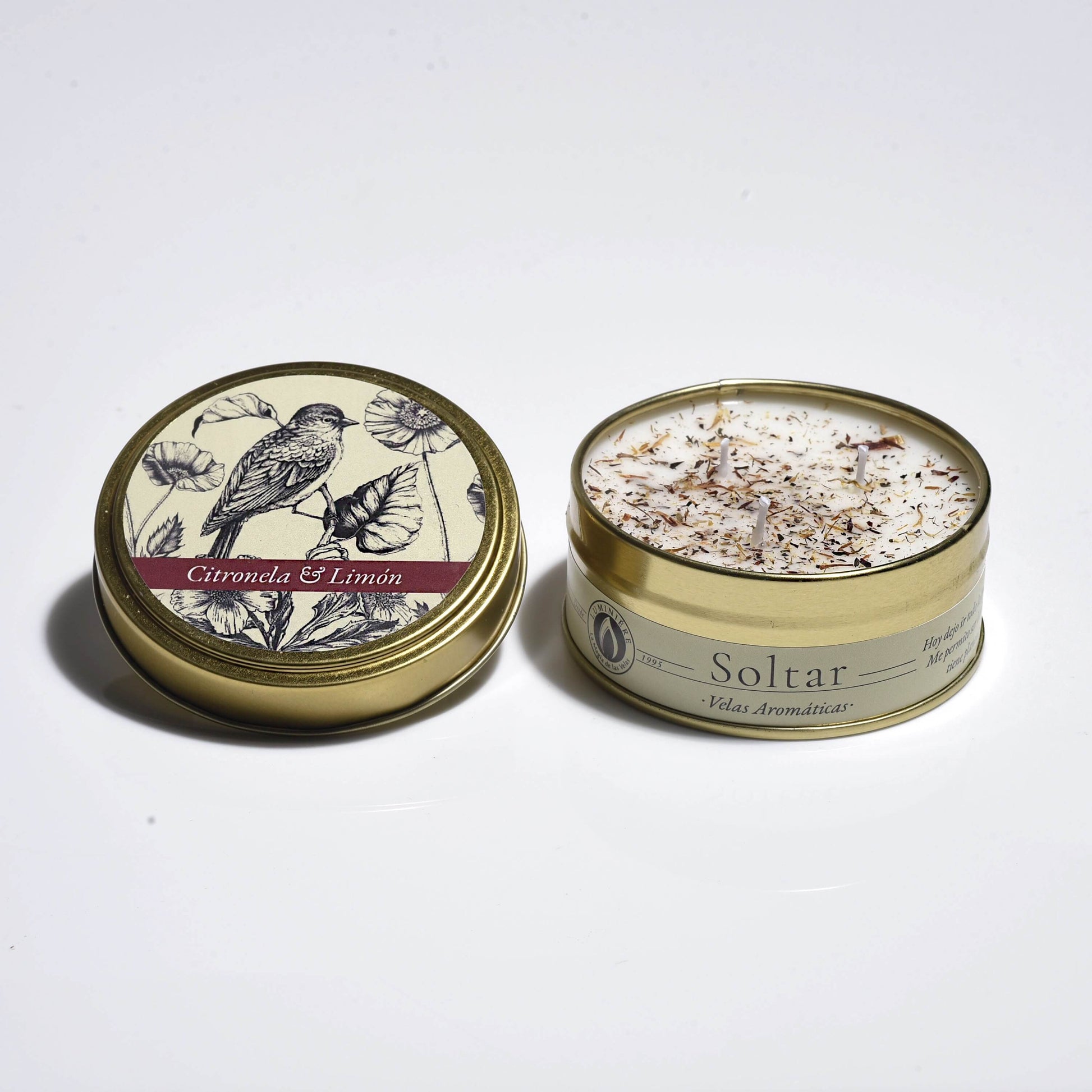 Vela aromática de Citronela y Limón, fabricada en cera de soya, con pabilo 100% de algodón y en envase de vidrio con tapa metálica.