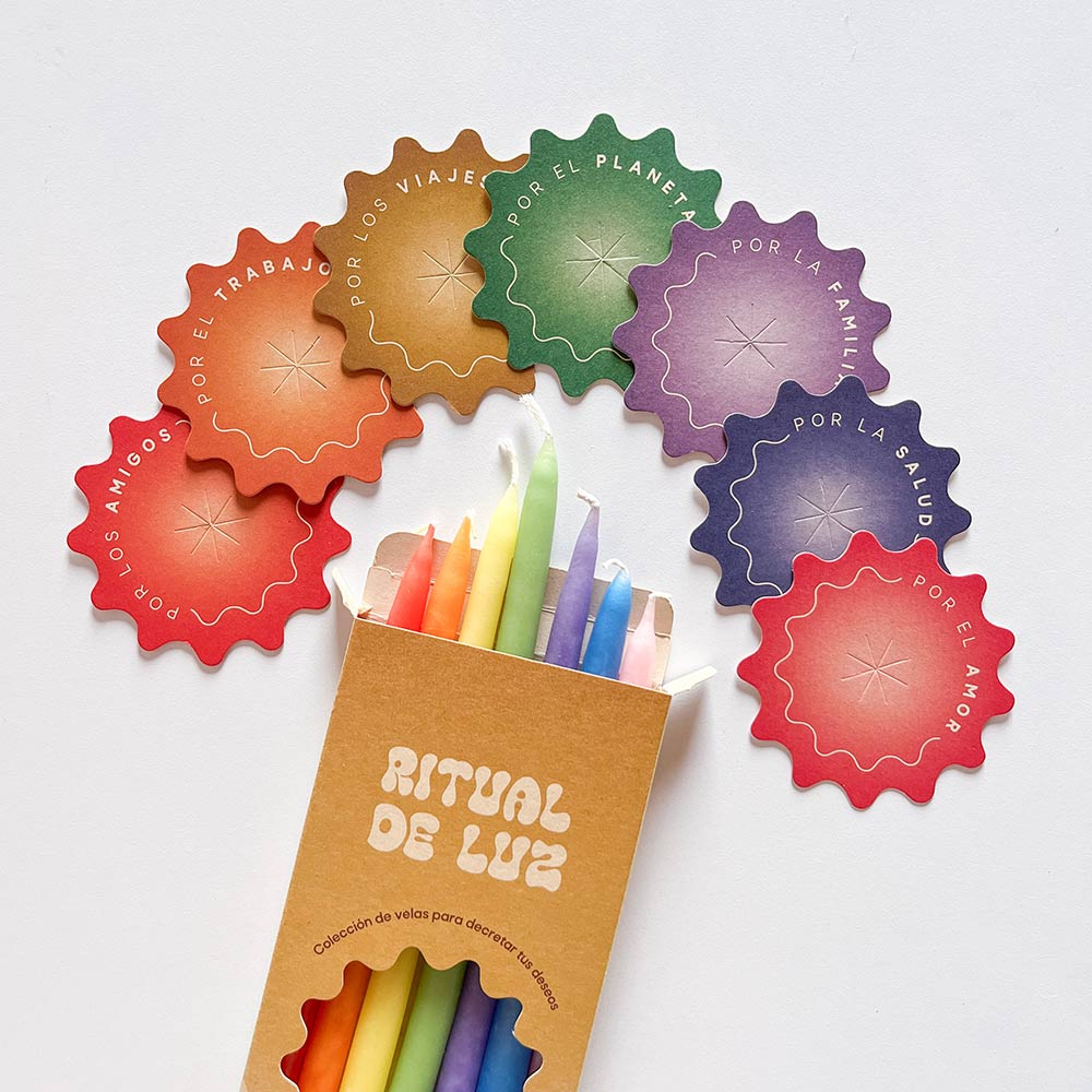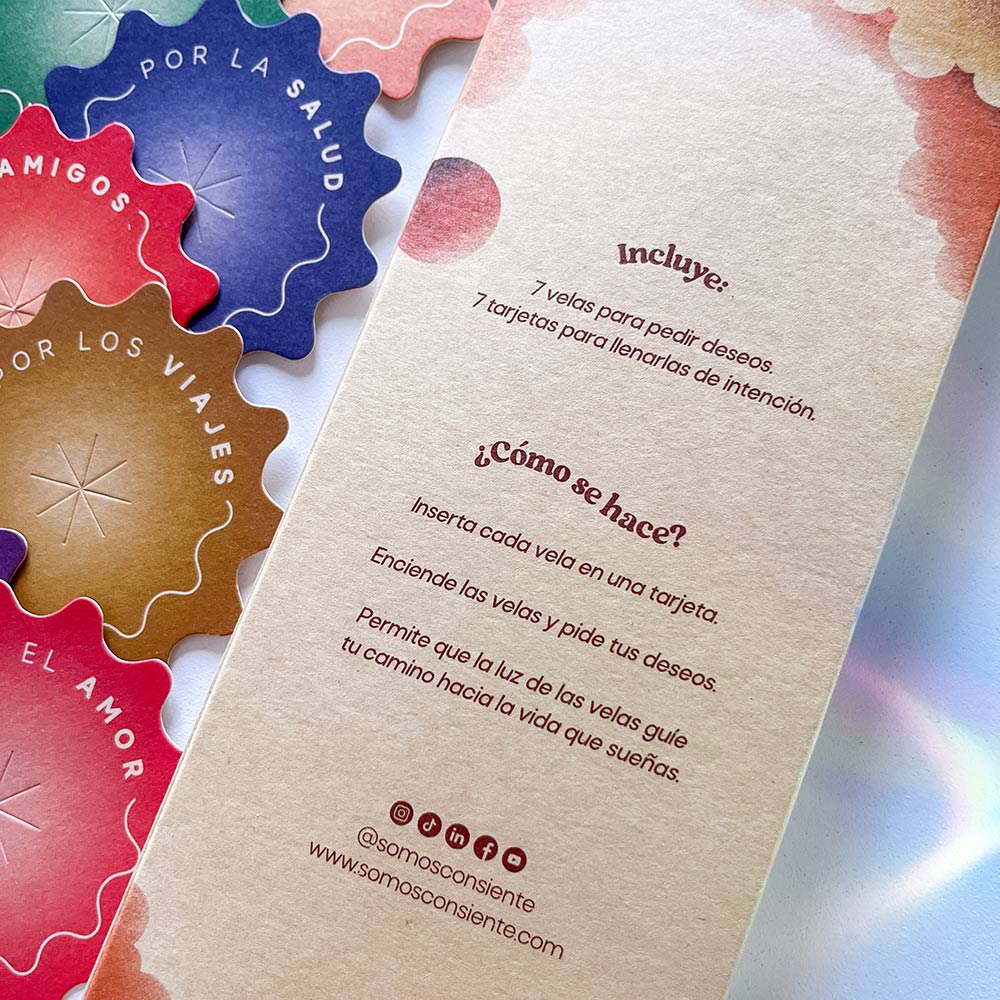 Colección de 7 velas con 7 tarjetas para decretar tus deseos.