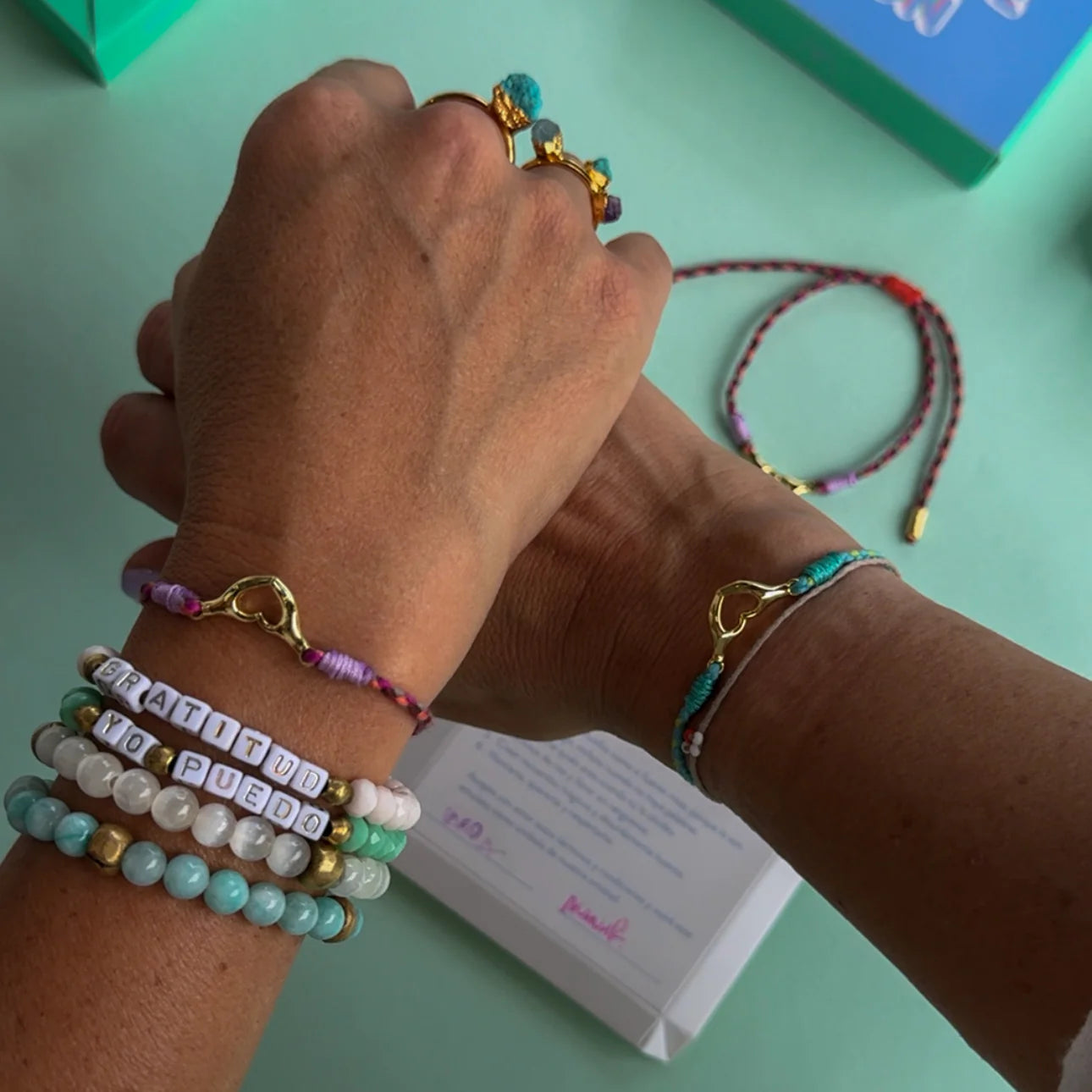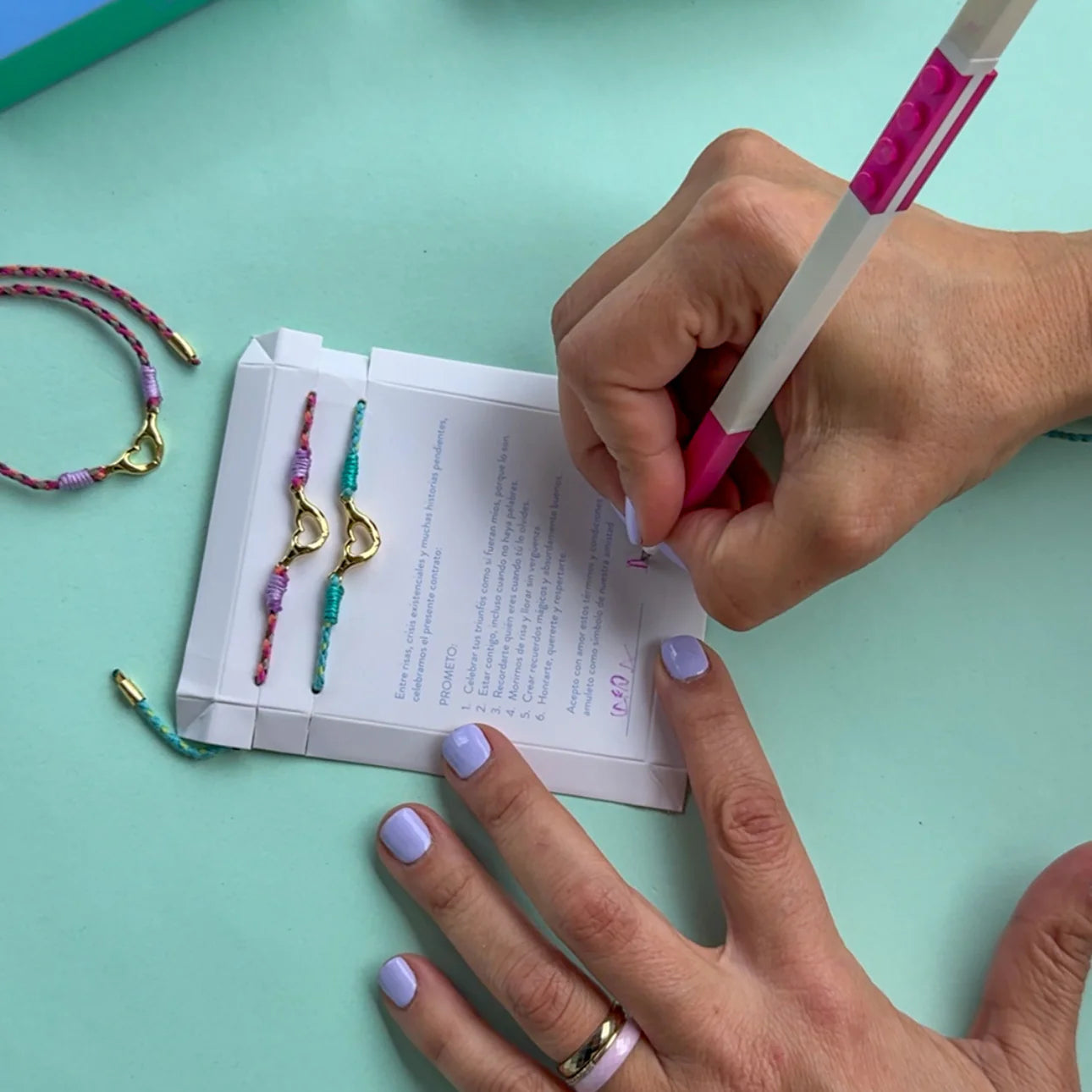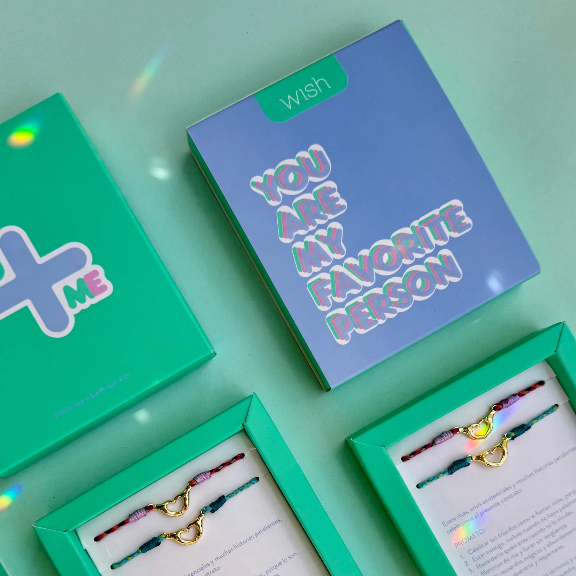 Este set incluye dos pulseras ajustables con dije de manos doradas y un contrato para sellar esa relación que ya es ley: la risa eterna, los secretos compartidos y la certeza de estar ahí siempre.