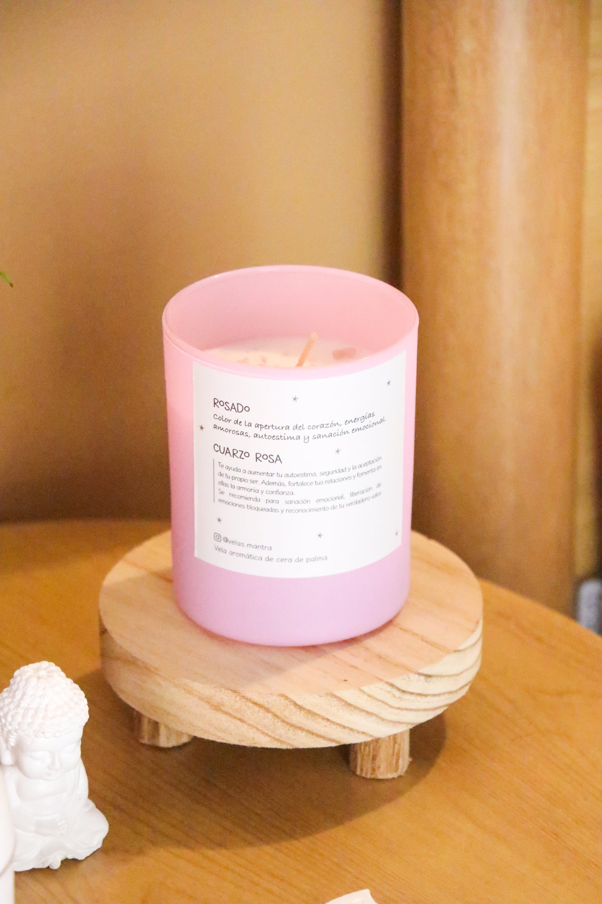 Velas aromáticas de 1 mecha, hechas en cera de palma, esencias para aromaterapia variadas y pabilo 100% de algodón, vaciadas en envases de cristal rosa y con cuarzo rosa en la superficie.